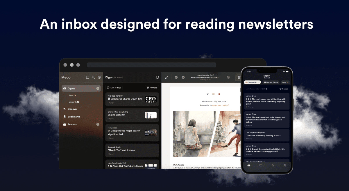 Reading newsletters in the inbox is frustrating - it is noisy and easy to lose control of subscriptions. Now with Meco, you can enjoy your newsletters in an app built for reading, while giving your inbox space to breathe.